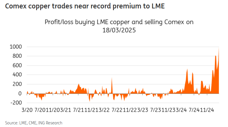 关税威胁下,美国进口商疯狂囤铜,导致美国Comex期铜价格与LME溢价升至每吨 1200 美元以上,接近 2 月中旬创下的历史新高。分析认为,溢价正在重塑全球铜贸易格局,亚洲可能面临供应短缺,这种混乱局面短期内支撑铜价上涨。