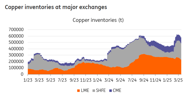 据荷兰国际集团(ING)研究部,关税威胁导致交易商将铜从全球 LME 仓库转移到美国,以利用套利机会。自特朗普赢得总统大选以来,CME 铜库存一直在稳步上升。进入美国的货物大部分来自南美,但也有一些来自亚洲。伦敦金属交易所的库存出现小幅下降。