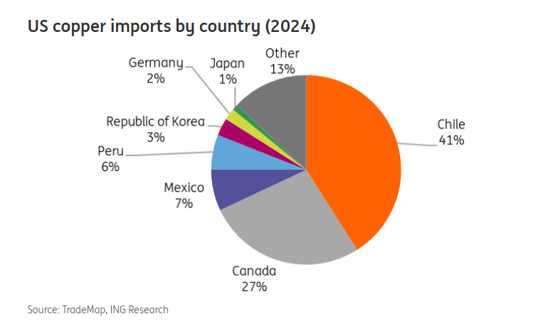 美国国内消费依赖铜进口,智利是该国最大的供应国,占 41%,其次是加拿大,占 27%。