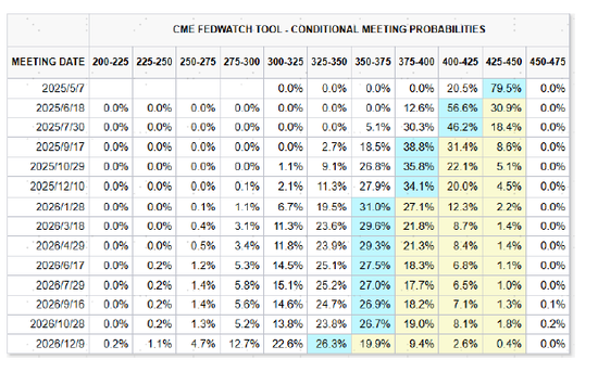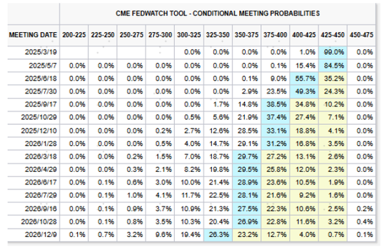 维持基准利率在4.2%~4.5%,符合预期。1月FOMC中鲍威尔就表示降息的条件是要看到通胀回落的实际进展以及就业市场的疲弱(《暂停降息才能继续降息》),而在此期间公布的1、2月非农和通胀数据仍有韧性,更何况关税等供给通胀风险还萦绕不散,因此3月暂停降息也已是市场共识,CME利率期货隐含3月暂停降息的概率高达99%。