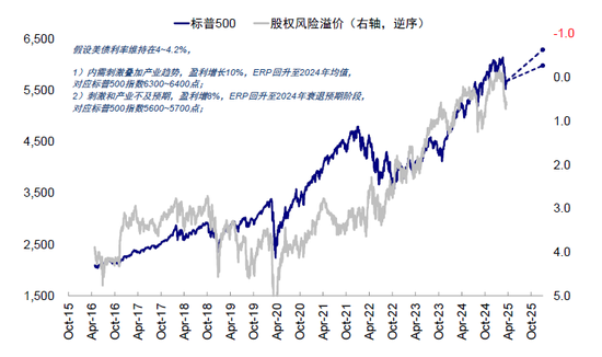 图表:基准情形下,我们测算2025年标普500指数10%的盈利增长基本对应 6300~6400