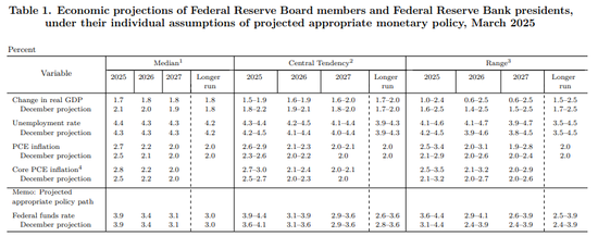 美联储大幅下调2025年经济增长预测,上调通胀率预估,围绕经济前景的不确定性增加。美联储决策者预计2025年GDP增长率为1.7%,12月时预估为2.1%;预计长期增长率为1.8%,与12月预估持平。美联储决策者预计2025年底PCE物价指数上升2.7%,12月时预估为上升2.5%;核心PCE物价指数上升2.8%,12月时预计上升2.5% 。
