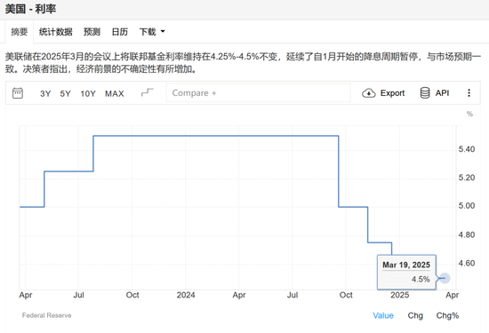 北京时间3月20日(周四)凌晨02:00,美国联邦储备委员会宣布将联邦基金利率目标区间维持在4.25%至4.50%之间,符合预期。美联储自2024年9月连续降息,这是今年1月以来美联储连续第二次维持利率不变。