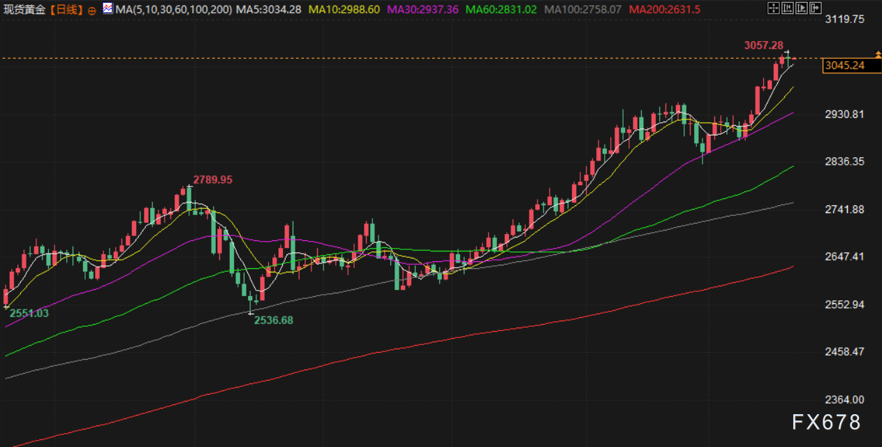 现货金因获利回吐下跌0.3%,报每盎司3038.79美元。稍早触及3057.21美元的历史高位。