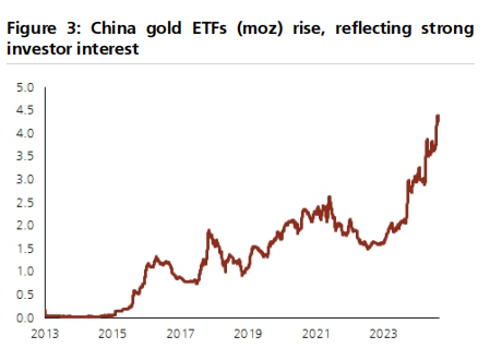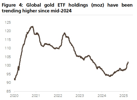 瑞银指出,全球黄金ETF自2024年中旬开始呈现上涨趋势。