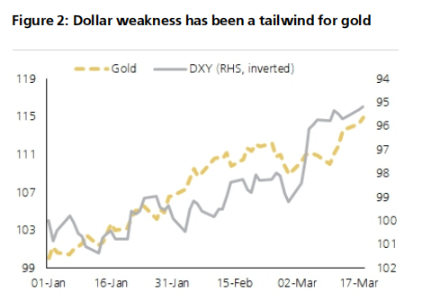 瑞银表示金价持续的上涨是由于不断加剧的贸易紧张局势、日益增长的经济增长担忧、持续存在的地缘政治风险,此外美元的疲软也是因素之一。