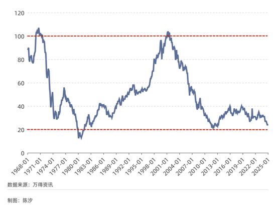 图3是美国人均可支配收入与黄金价格的比值(人均可支配收入数据为月度折年数,单位为美元;黄金价格为月度平均值,单位为美元/盎司)。可以看出,该比值(下称“K值”)在黄金熊市时,上限约为100;在黄金牛市时,下限一般不会小于20。