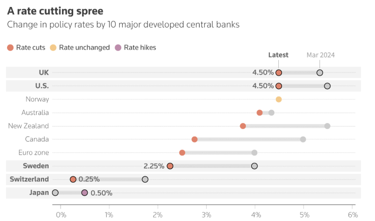 本周可以说是特朗普2.0上任迄今最为受到瞩目的一个央行超级周——美国、日本、英国、瑞士、瑞典和巴西等全球十余家都公布了利率决议。而最终的结果显示,全球各地的货币政策制定者或多或少都被白宫政策的曲折变化打乱节奏,不少处于宽松周期的央行都因关税引发的通胀焦虑,而削弱了对进一步降息的预期。