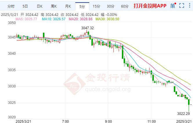 本交易日(3月21日)现货黄金短线突然大幅下挫,截止发稿金价报3025.59美元/盎司,跌幅0.62%,今日开盘报3042.37美元/盎司,最高触及3047.32美元/盎司,最低触及3021.49美元/盎司。