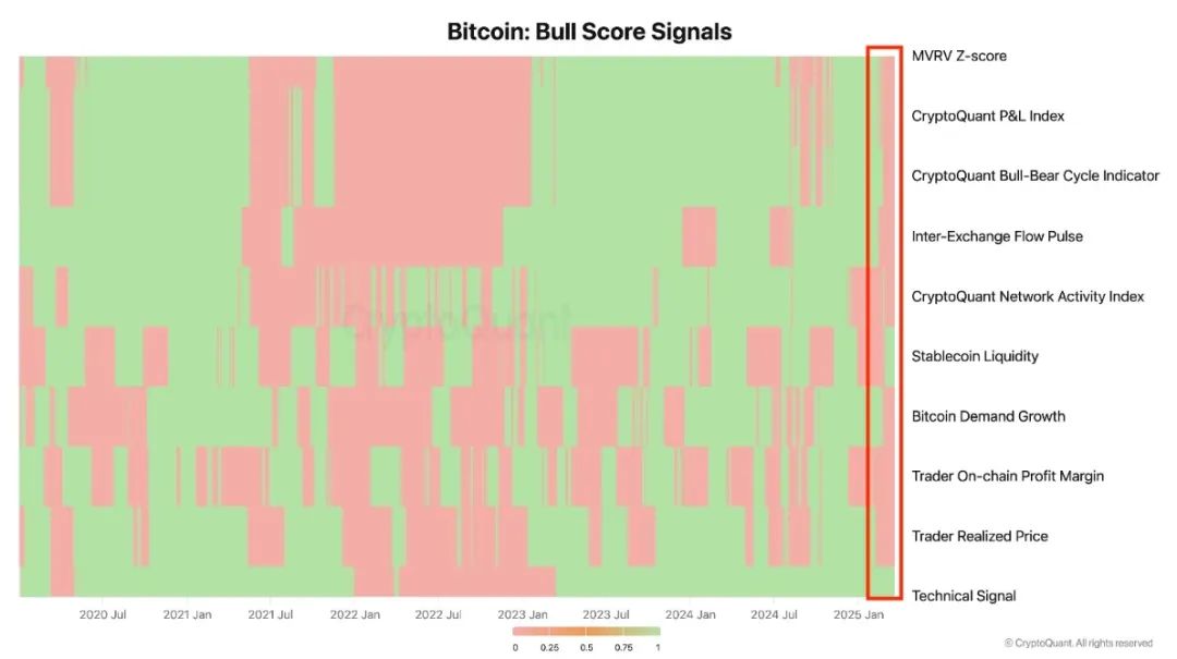 同样,CryptoQuant上的10个链上信号中有8个已转为看跌。如上所述,除了稳定币流动性和技术信号指标外,所有其他指标均呈红色闪烁,强调了比特币价格可能回调的可能性。