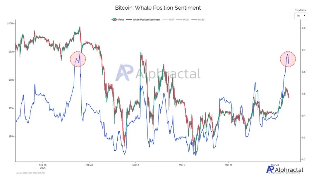 如图所示,两个圆圈区域代表比特币价格跌至88000美元水平。Alphractal表示,“当巨鲸持仓情绪开始下降时,即使价格暂时上涨,这也是巨鲸进入空头仓位的强烈信号,这可能导致价格下跌。”
