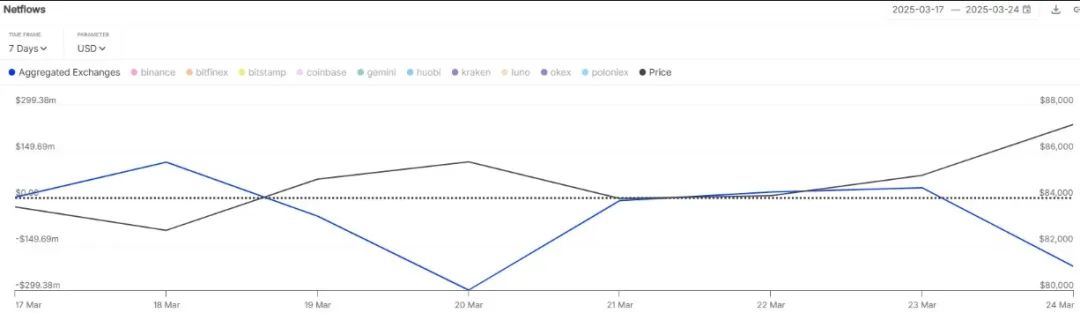 尽管链上指标转为红色,但一些投资者对比特币表现出信心。IntoTheBlock数据显示,过去24小时内,交易所的比特币净流出量为2.2亿美元。3月18日至24日期间,这一金额达到4.24亿美元。这一趋势意味着某些持有者正在积累。