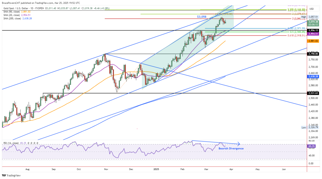 下行方面,跌破周二低点3007美元表明可能出现更大幅度的回调,而跌破周五低点和周低点2999美元则表明可能出现更大幅度的回调。下行的初始目标包括38.2%斐波那契回撤位2972美元和前期趋势高点2956美元。请注意,20日均线已与前期高点汇合,并继续上涨。20日均线位于2955美元,这也是一个重要的短期回调目标。