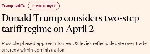 英国《金融时报》(Financial Times)披露,特朗普正在考虑分两步实施新的关税制度,在对贸易伙伴的调查完成期间,部署很少使用的权力来征收紧急关税。