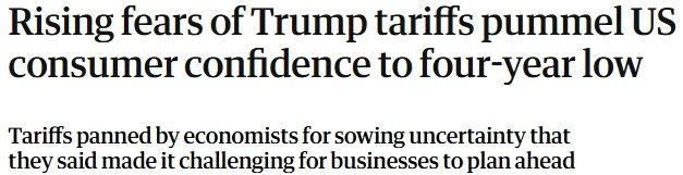 美国消费者信心3月份跌至四年多以来的最低水平,家庭担心未来出现经济衰退以及关税导致通胀上升。