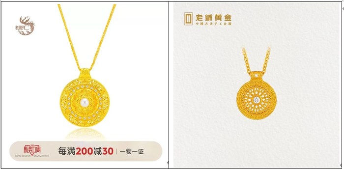 首先,老铺黄金产品内涵方面仍不具有奢侈品的辨识度。与诸如梵克雅宝的“四叶草”系列、卡地亚Love手镯等具有全球辨识度的经典款不同,老铺黄金的产品线虽涵盖吊坠、手镯、戒指等十余个品类,却缺乏标志性设计元素,这也导致其易于被仿制。