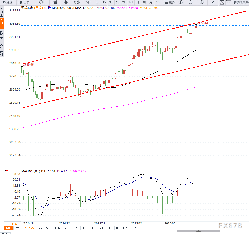 技术层面上,黄金日线级别已经突破收敛压力,且进入二次拉伸区间,但上行通道压力依然存在,等待3100美元附近压力测试为主。