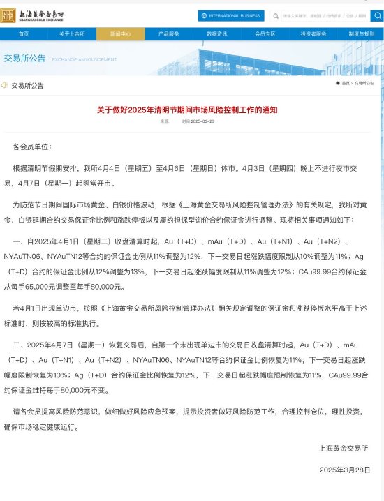 3月28日,上海黄金交易所发布《关于做好2025年清明节期间市场风险控制工作的通知》,《通知》中提到,根据清明节假期安排,上金所4月4日(星期五)至4月6日(星期日)休市。4月3日(星期四)晚上不进行夜市交易,4月7日(星期一)起照常开市。