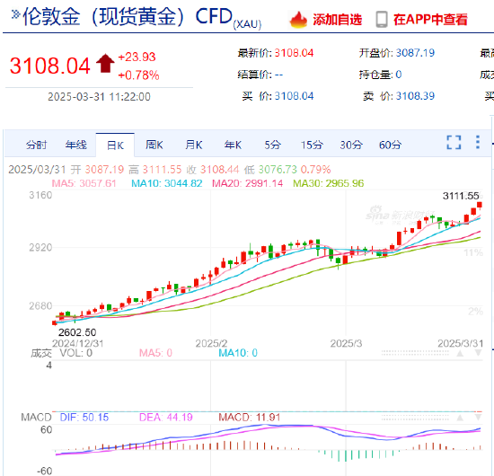 3月31日讯,现货黄金今日刷新历史新高,截止发稿时最高价涨超3111美元/盎司,以公斤计算(1金衡盎司=31.1035克),一公斤黄金的价格首次超过了10万美元。