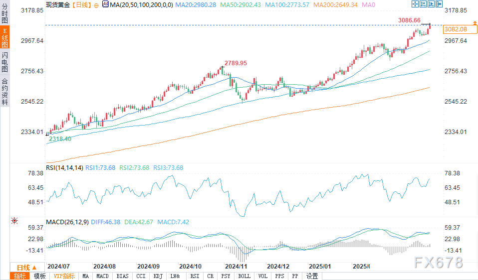 北京时间22:24,现货黄金报3081.77美元/盎司,涨幅0.82%。