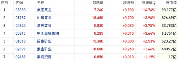 截至发稿,灵宝黄金(03330.HK)涨近15%,续创多年来新高;潼关黄金(00340.HK)、山东黄金(01787.HK)均涨超3%,招金矿业(01818.HK)等个股也纷纷跟涨。