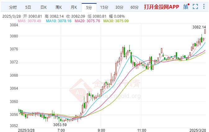 今日周五(3月28日)欧盘,伦敦金维持震荡偏强走势,截至发稿金价位于3080.99美元/盎司,涨幅0.80%,今日开盘报3054.77美元/盎司,最高上探3082.53美元/盎司,最低触及3053.59美元/盎司。