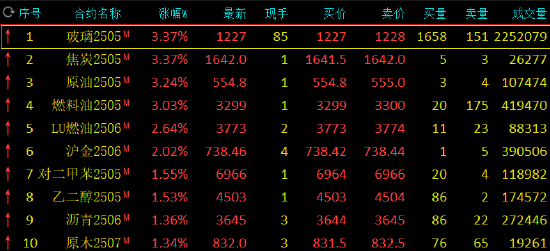 早盘收盘,国内期货主力合约涨跌互现。玻璃、焦炭、SC原油、燃料油涨超3%,低硫燃料油(LU)、沪金涨超2%。跌幅方面,菜粕、烧碱、纸浆、甲醇、氧化铝跌超1%。
