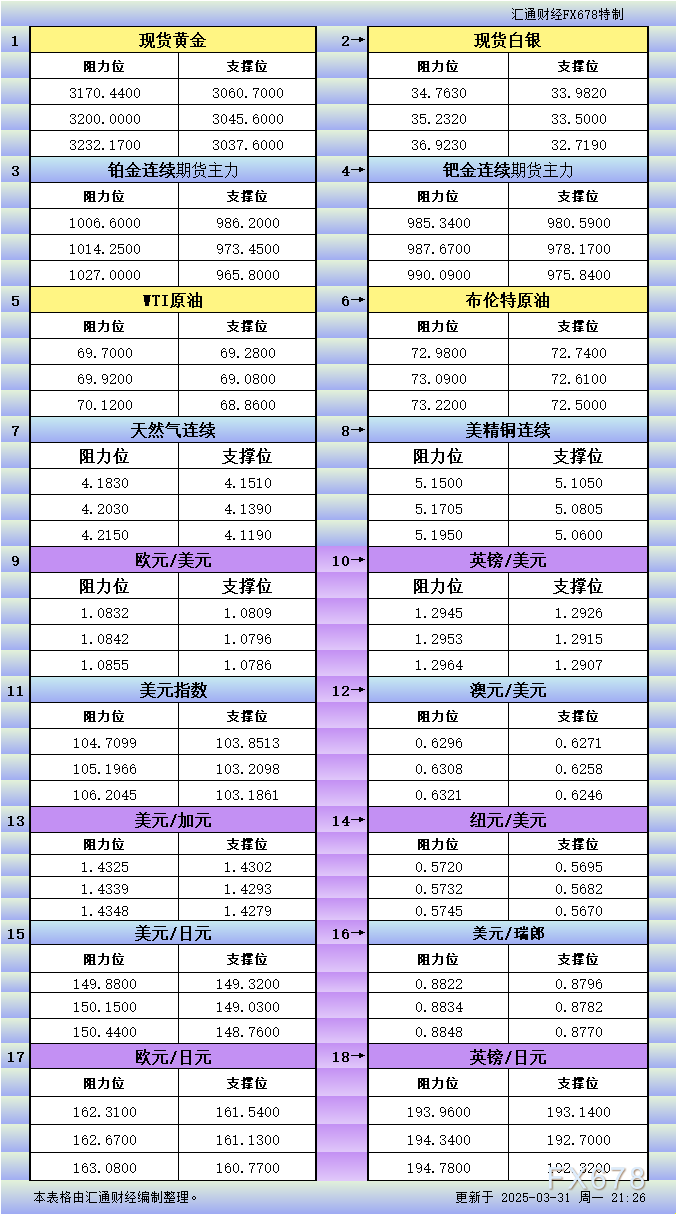 XM官网:3月31日美市更新支撑阻力:18品种支撑阻力(金银铂钯原油天然气铜及十大货币对)