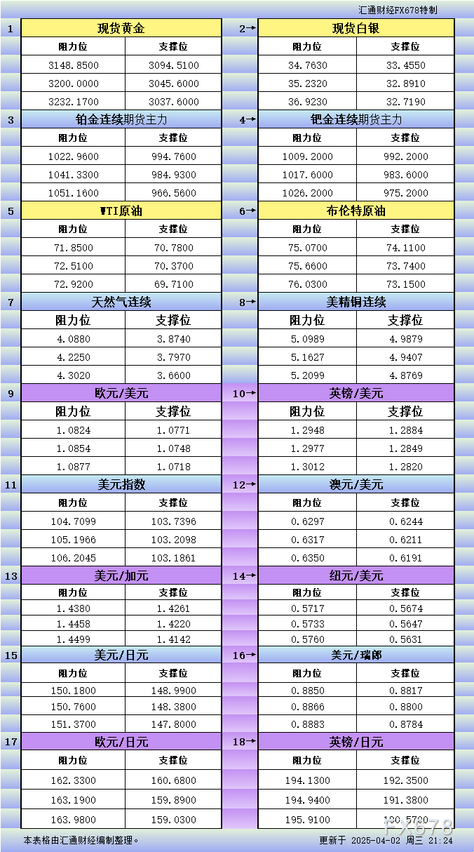 XM官网:4月2日美市更新支撑阻力:18品种支撑阻力(金银铂钯原油天然气铜及十大货币对)