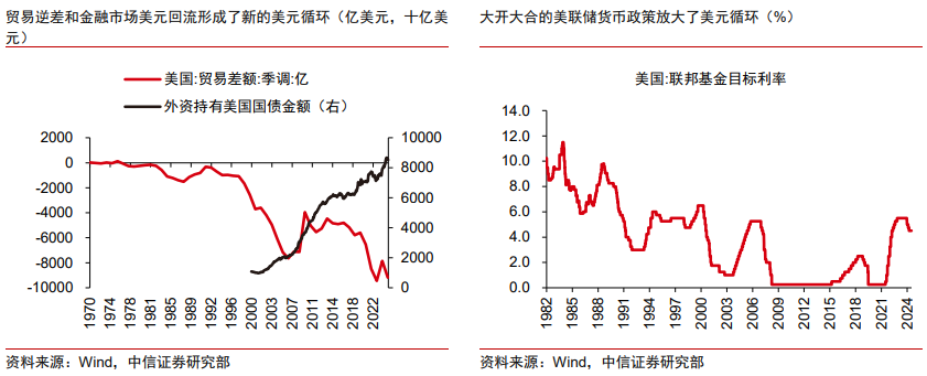 1976年,《牙买加协议》通过,国际货币体系从黄金“锚”转向信用“锚”。牙买加体系有两大特点。一方面,不同于金本位体系和布雷顿森林体系,牙买加体系是建立在浮动汇率之上的,《牙买加协议》规定了成员国拥有选择汇率制度的权利,并且明确了浮动汇率制的合法性;另一方面,货币开始与黄金脱钩,国际货币体系的锚从黄金转化为各国的主权信用。不过,与布雷顿森林体系类似的是,美国依旧是全球货币体系的核心,且牙买加体系形成了与布雷顿森林体系相反的美元循环体系。