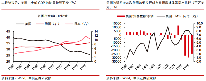 在金本位体系崩溃的时候,美国却成为了最主要的受益者,布雷顿森林体系随之诞生。不过,在理想状态下,美国通过欧洲战后重建与马歇尔计划以对外投资的方式输出美元,同时通过对外出口和贸易顺差回收美元,能够形成理想的闭环。但现实情况是,战后美国经济一枝独秀的局面未能长期持续,欧洲和日本经济的复苏推动其与美国经济之间的差距逐步收敛,且“双挂钩”的体系隐含着对美国经济和货币政策体系的高度信任,而美元超发或美国黄金储备不足的问题都会动摇布雷顿森林体系的基础,这也就是所谓的“特里芬难题”。美国黄金储备的下降和暂停美元兑换黄金最终导致了布雷顿森林体系的终结。