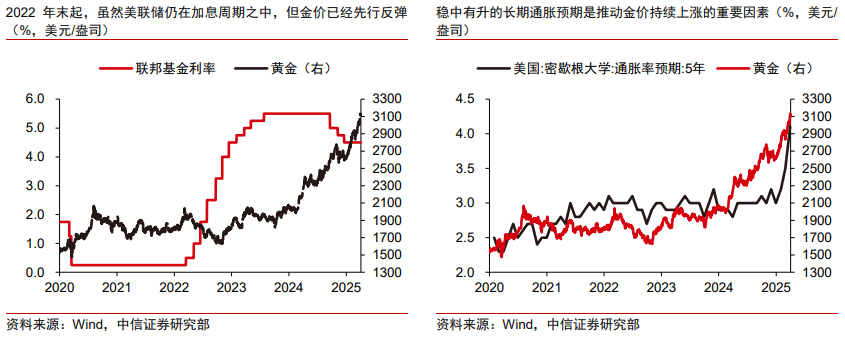 当前美国仍是全球货币体系的核心。黄金无法替代美元,但却能成为对冲美元风险的重要资产。对于非美经济体而言,美元的风险一方面在于美国国内,即美国的长期高通胀风险和特朗普政策风险,这对应着黄金的抗通胀属性和避险属性;另一方面则在于当前的全球货币体系,即其他经济体对于美元信用体系的隐忧和强化本国主权信用的需求,这对应着黄金的信用属性。整体而言,在当前的宏观环境下,能够影响金价的因素更加多元而复杂。不可否认的是美联储货币政策依旧是影响金价的最重要因素之一,但从过去几年的金价表现可以看出,美联储货币政策并非金价的决定性因素,抗通胀属性、避险属性和信用属性对金价的影响正在加强。