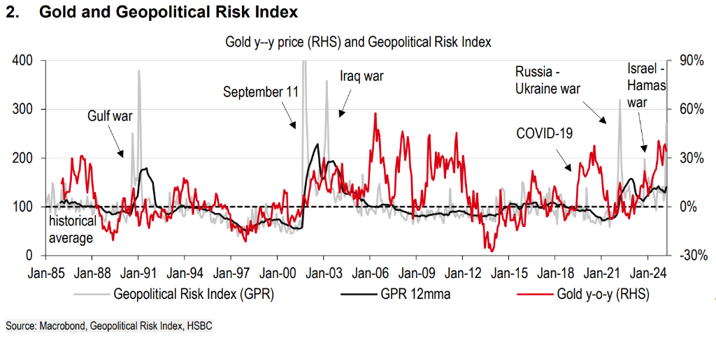 除贸易紧张外,地缘政治风险也是推动黄金走强的主要因素。汇丰的研究确认,黄金作为安全港资产,在经济和地缘政治不确定性时期表现出色。