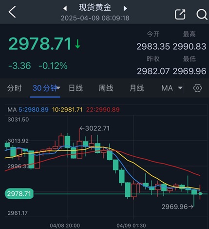 周二纽约时段早盘,现货黄金一度触及3022.71美元/盎司,创下日内高点。但随后金价大幅下挫,纽约时段盘中,金价最低跌至2974.69美元/盎司,为日内低点。