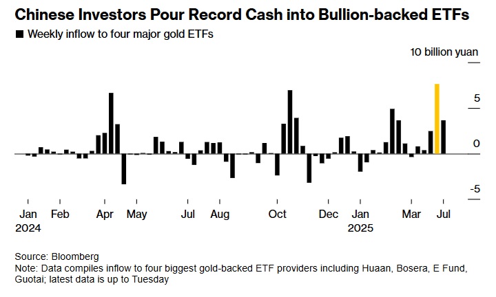 据彭博社计算,上周,包括华安易富(Huaan Yifu)黄金ETF在内的四只主要在岸黄金ETF的流入量达到创纪录的76亿元人民币(约合10亿美元),本周流入量持续强劲。美国总统特朗普宣布征收高额关税导致全球股市市值蒸发数万亿美元,并引发人们对经济衰退的担忧,导致黄金ETF流入量激增。