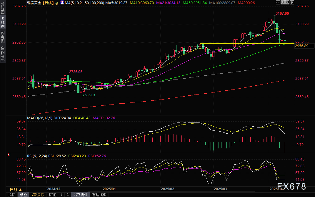 周三(4月9日)亚市早盘,现货黄金维持窄幅震荡,交投于2981美元附近。前一交易日,金价反弹受阻,盘中一度冲高至3022美元,但受美债收益率攀升及美股下跌拖累,最终回吐涨幅,收报2982附近。尽管美元走软和贸易紧张局势为黄金提供避险支撑,但市场对美债标售需求疲软、美联储政策前景及股市波动加剧的担忧仍主导短期情绪。