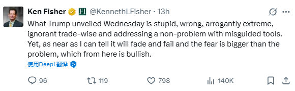财联社4月8日讯(编辑 马兰)美国政府的关税政策引发了全球金融市场动荡,但亿万富翁投资者,Fisher Investments的创办人Ken Fisher对此却颇为淡定,认为市场将迅速反弹。