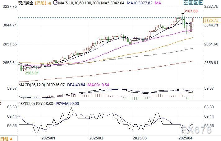 现货黄金日线图 来源:易汇通北京时间4月10日12:23 现货黄金 报 3125.75 美元/盎司