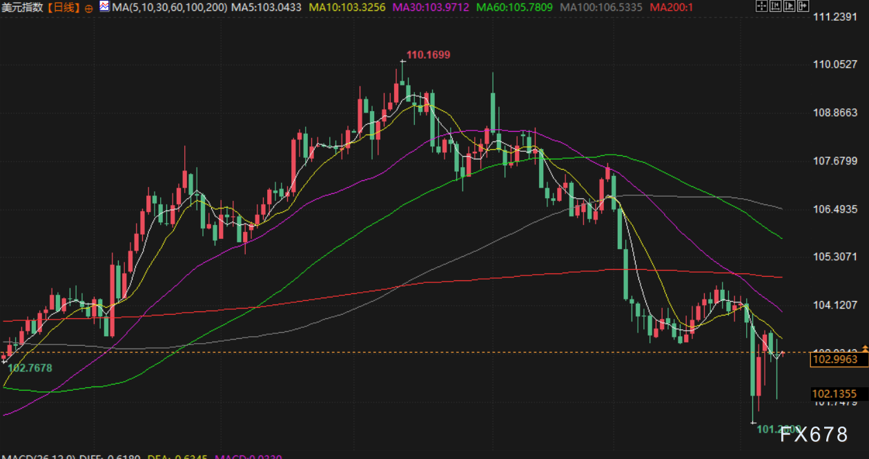 衡量美元兑一篮子货币(包括日元和欧元)汇率的美元指数从盘初的跌势中反弹。该指数上涨 0.11%,至 102.88 点。