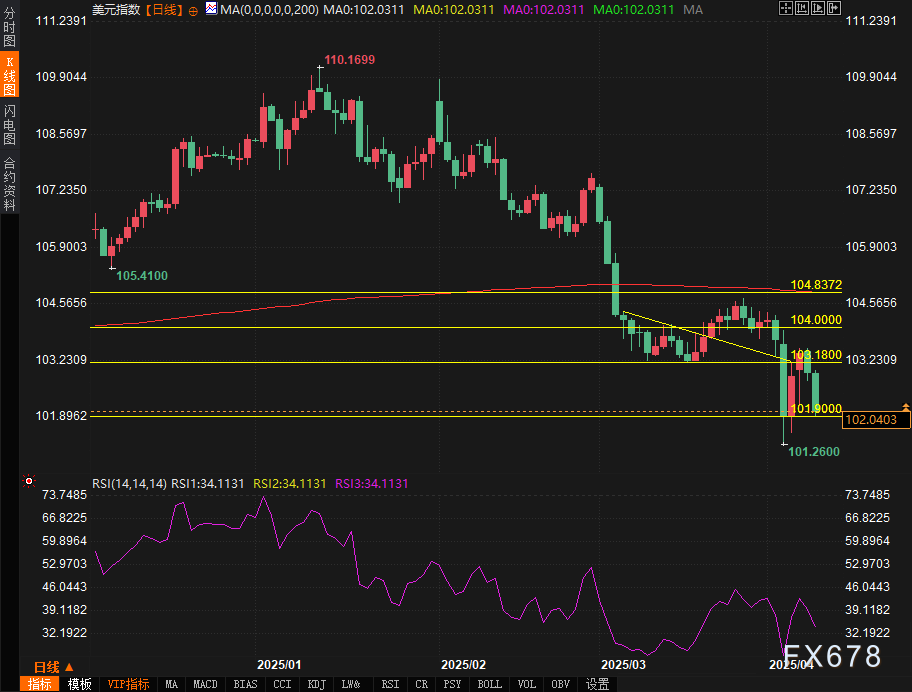 关键支撑测试: 美元指数在101.90附近暂获支撑,该位置曾在上周多次遏制跌势。但若关税负面影响持续发酵,下破101.90将打开通往100.00整数关口的空间。 反弹阻力: 103.18(3月支撑转阻力)为首要压制,突破后需关注104.00心理关口及200日均线104.85。当前均线系统呈空头排列,暗示反弹动能有限。