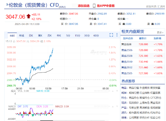 新浪期货讯,4月9日,现货黄金一度突破3050美元/盎司,较日低回升80美元,涨超2%。