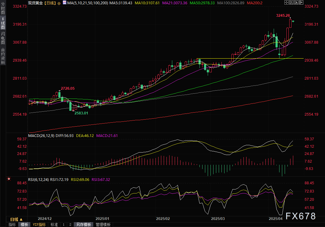 短期来看,黄金上行逻辑依然坚实:贸易战不确定性持续发酵、美元弱势周期开启、美联储降息临近及地缘风险溢价未消,均为金价提供支撑。技术面上,金价突破3200美元后打开新的上行空间,多头动能充沛。