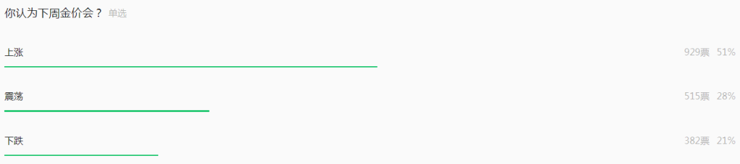 4月7日当周,伦敦金价格开盘3028.69美元/盎司,最高3245.26美元/盎司,最低2956.3美元/盎司,收盘3237.52美元/盎司。北京黄金经济发展研究中心调查显示,市场人士认为本周国际金价上涨可能性较大。投票显示,有51%的读者看涨本周金价、28%看震荡、21%看空。