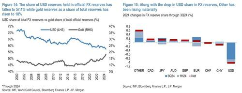 美元储备多元化的步伐也正在加速。国际货币基金组织最新的COFER数据显示,储备管理者在2024年第三季度抛售了965亿美元的美元资产,使美元储备份额下降至57.4%,较上一季度大幅下降,创下本地新低。