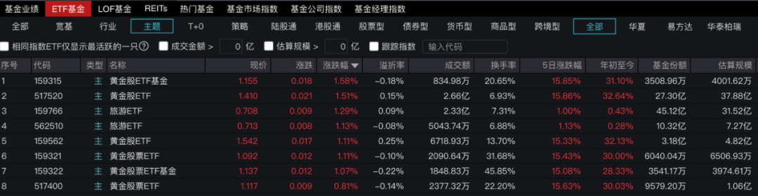 基金市场上,多只黄金主题ETF持续活跃,截至发稿,黄金股ETF基金(代码:159315)、黄金股ETF(代码:517520)涨幅均超1.5%,成交额分别达834.98万元、2.66亿元。