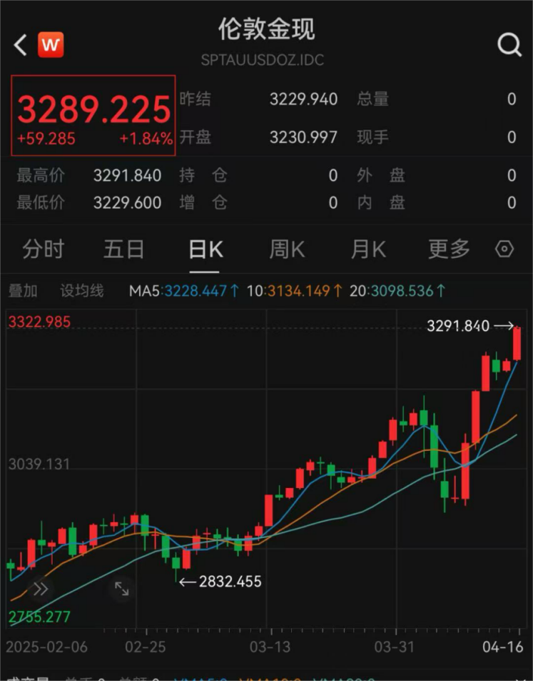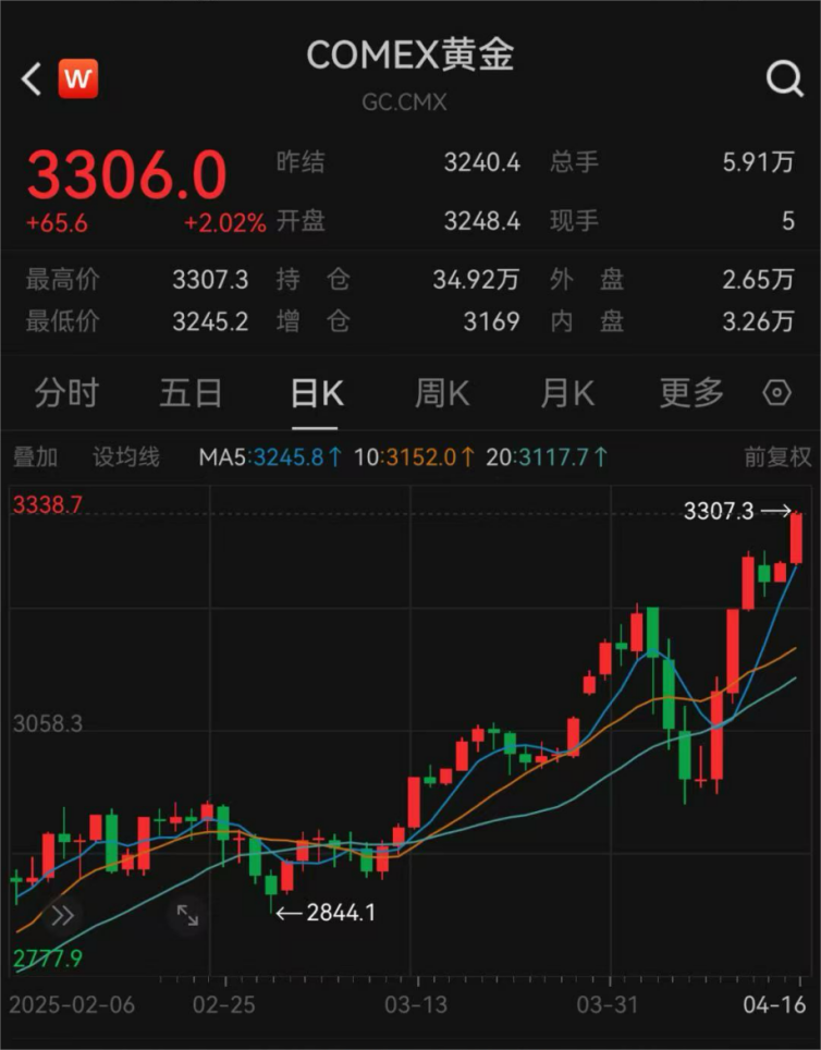 当日,COMEX黄金期货首次站上3300美元/盎司大关,现货黄金突破3280美元/盎司,双双创历史新高!