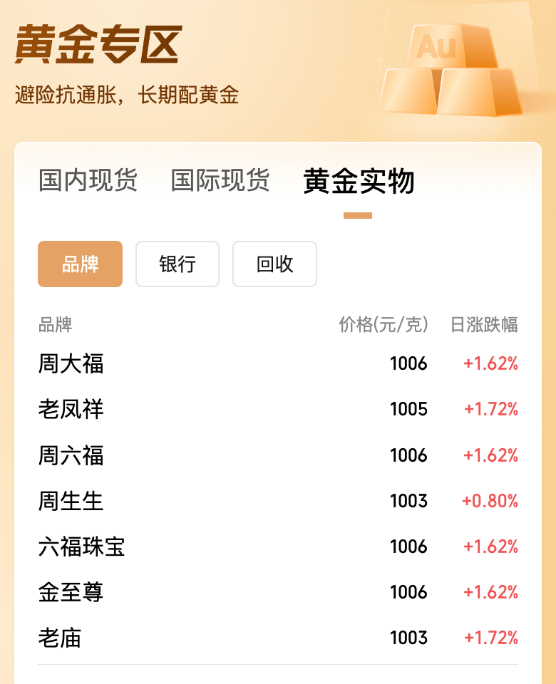 黄金实物方面,黄金品牌店铺的足金首饰价格也全面上涨,多家最新报价突破1000元/克。其中,周大福、周六福、六福珠宝、金至尊的金价均达到1006元/克。
