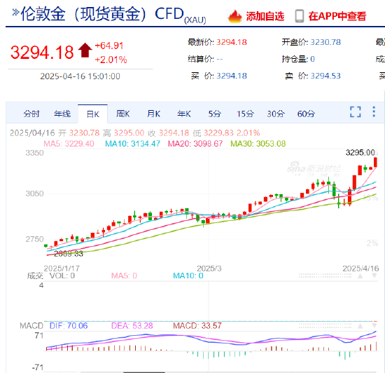 4月16日,现货黄金向上触及3290美元/盎司,最高价报3295美元/盎司,续刷历史新高!持续升级的美方乱局引发投资者对经济连锁反应的担忧,继续巩固传统避险资产黄金的需求。投资者正密切关注美联储主席鲍威尔关于利率路径的讲话(政策立场解读)、美方半导体与医药产品税具体实施方案以及中美后续贸易磋商进展。