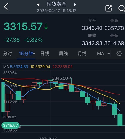 北京时间15:18,现货黄金报3315.57美元/盎司。