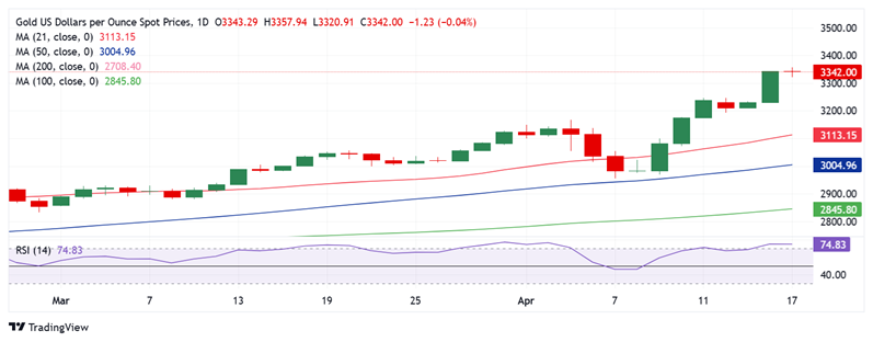 Mehtahi指出,黄金日线图显示,14日相对强弱指数(RSI)仍然严重超买,目前接近75,暗示可能会出现回调。